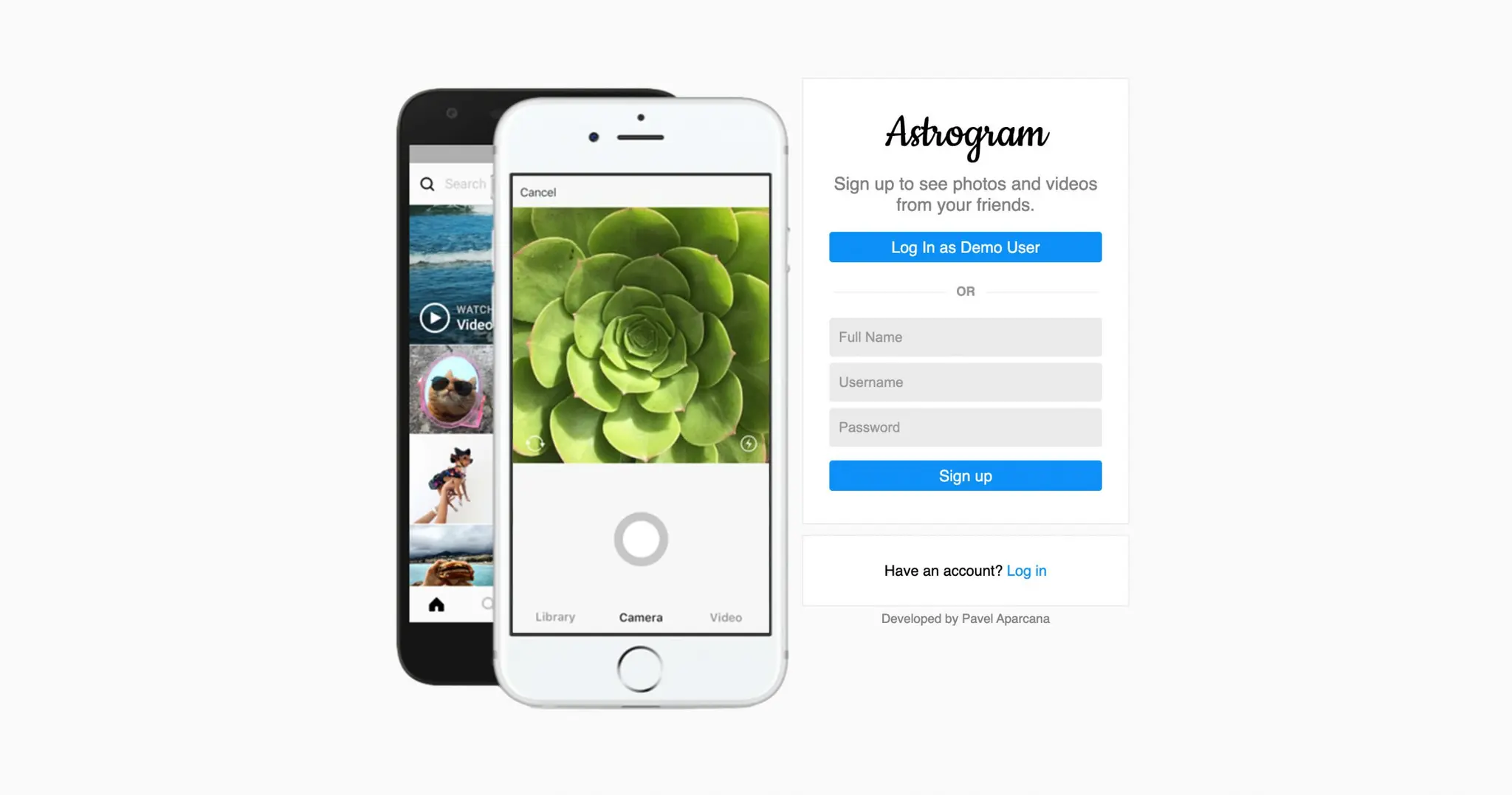 Project Astrogram was heavily inspired by the basic features of Instagram: creating an account, logging in, logging out, staying logged in after refreshing the page, having a profile show page for users, and having a different profile show options for the authenticated user. Furthermore, Astrogram has a feature outside of what is included in Instagram, uploading images from the browser instead of the app.